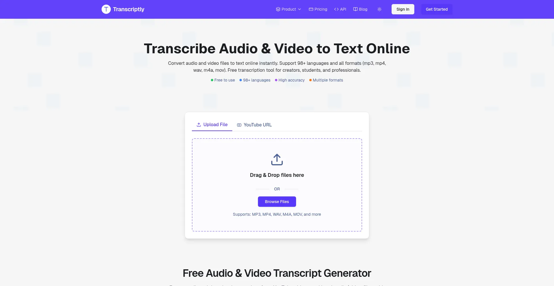 Transcriptly is a free audio and video to text converter. Convert YouTube videos and local media files (MP3, MP4, WAV, M4A, MOV) to text in seconds. Support 98+ languages. Perfe...