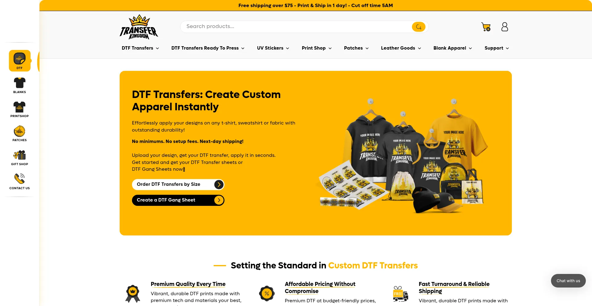 DTF Transfers guaranteed next day shipping. Explore Transfer Kingdom's custom dtf prints, ready-to-press DTF transfers, dtf gang sheets and blank apparel.