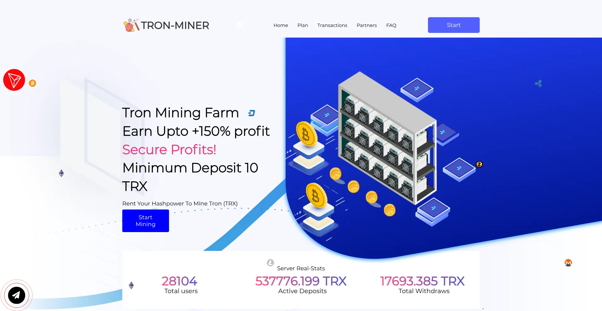 The tron-miner.top probably offers cloud mining services or cryptocurrency mining investments. Some platforms provide legitimate mining rental services, while others may use fake mining dashboards to display virtual earnings that cannot be withdrawn.