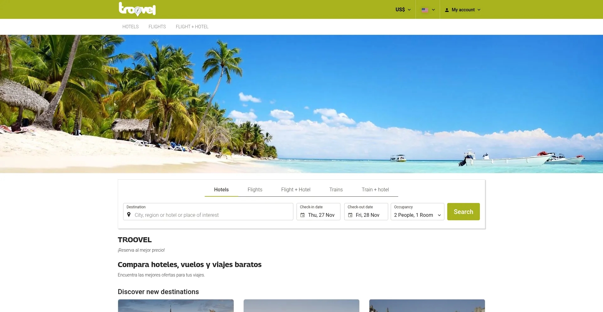 Busca y compara hoteles, vuelos y viajes organizados en todo el mundo. Encuentra las mejores ofertas para tus vacaciones y reserva al mejor precio con Troovel.