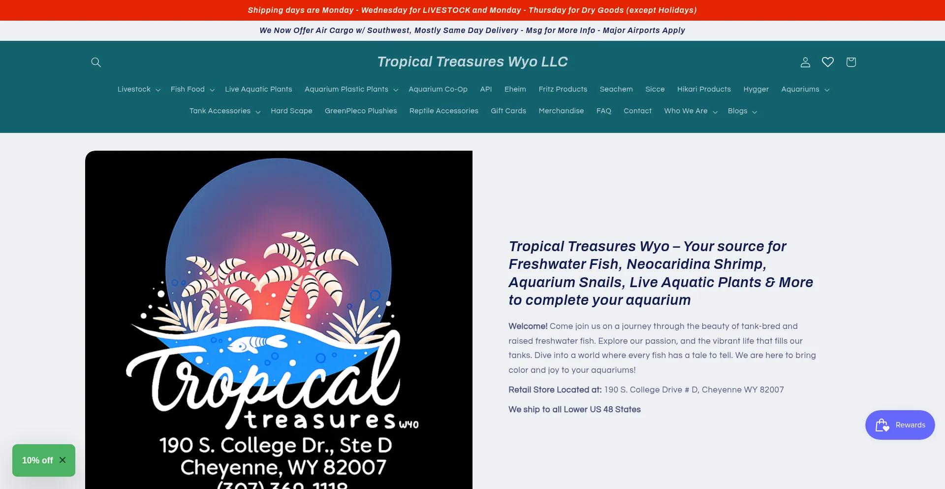 Tropical Treasures Wyo – your trusted freshwater aquarium store. Live fish, shrimp, snails, plants & supplies. Care guides + nationwide shipping guarantee.