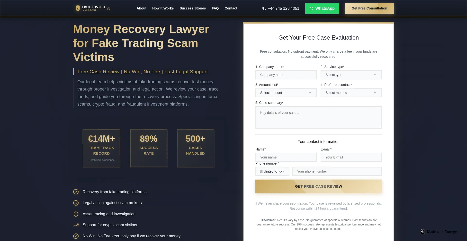 The website truejusticelawgroup.com advertises fund recovery services for lost or stolen assets. While some operate on contingency fee structures, others may require upfront payments, which can indicate fraudulent operations. Verify credentials and regulatory compliance before engaging such services.