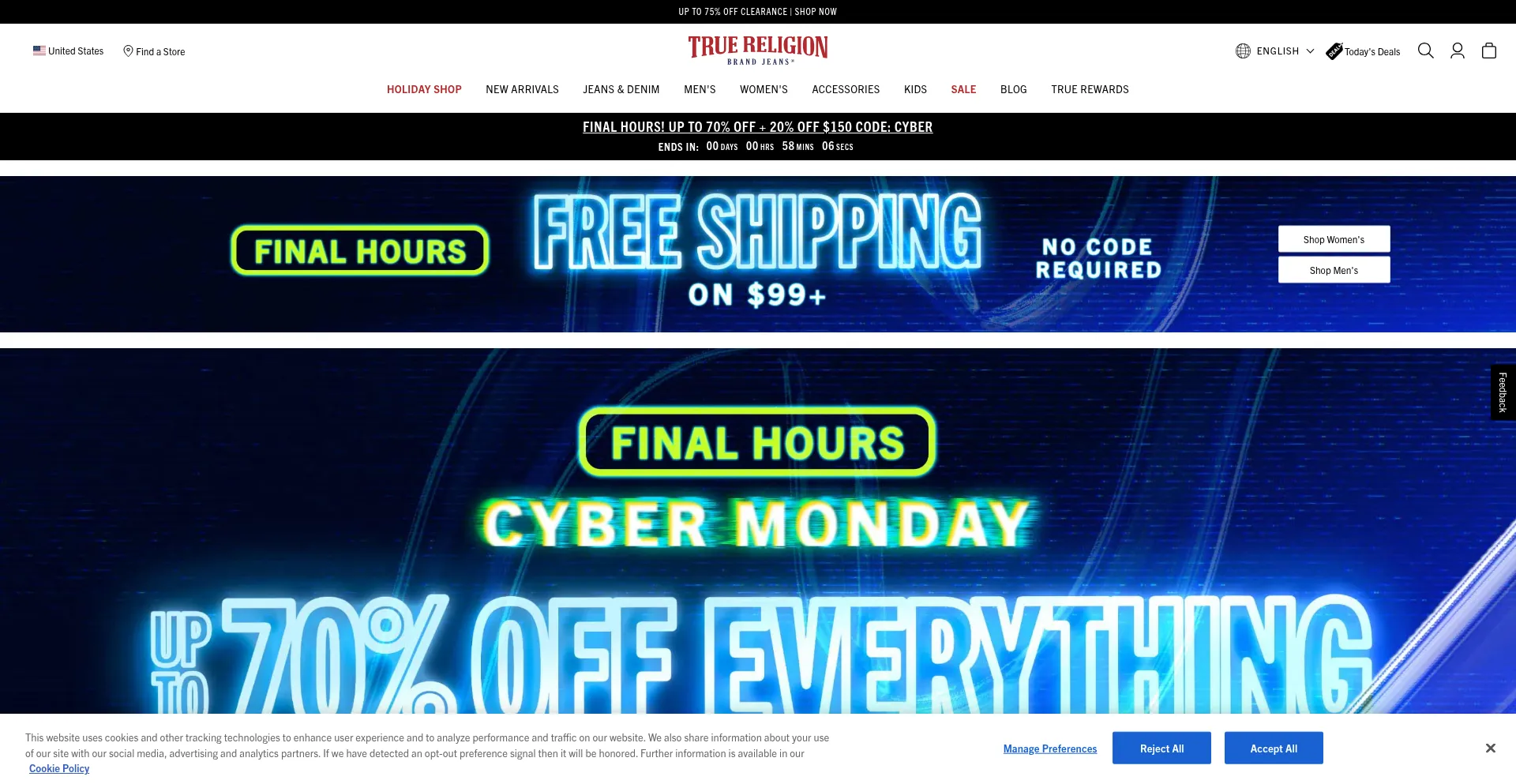 The website implements cookie consent mechanisms in compliance with privacy regulations such as GDPR or CCPA. This demonstrates that truereligion.com adheres to data protection standards and provides users with control over personal data collection practices.