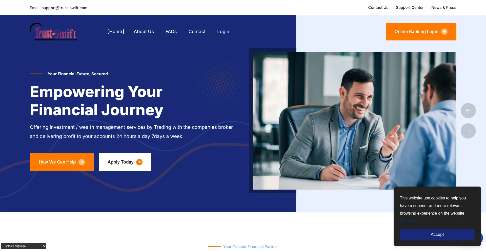 The trust-swift.com website provides financial services including investment management, wealth advisory, or financial planning solutions. Services may encompass portfolio management, investment opportunities, financial consulting, or asset growth strategies for individual and institutional clients.
