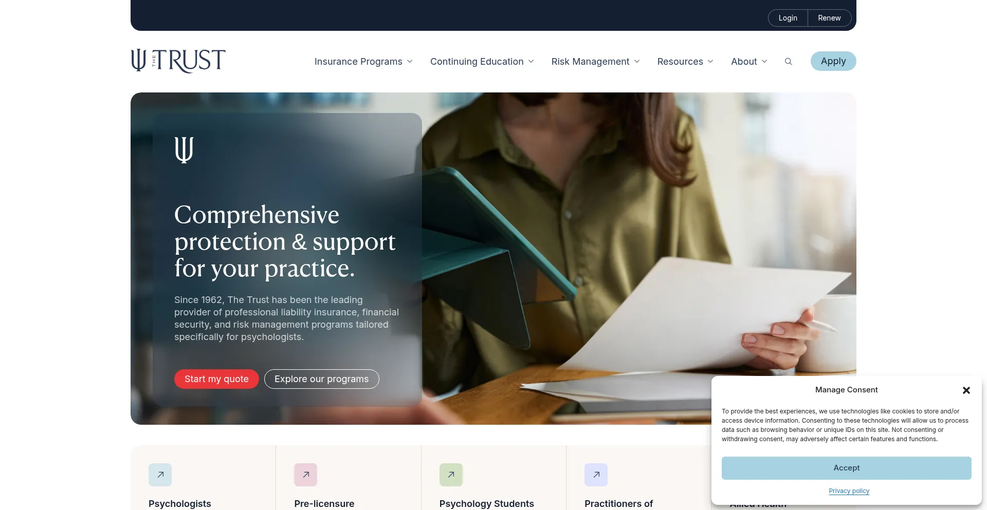 The website implements cookie consent mechanisms in compliance with privacy regulations such as GDPR or CCPA. This demonstrates that trustinsurance.com adheres to data protection standards and provides users with control over personal data collection practices.