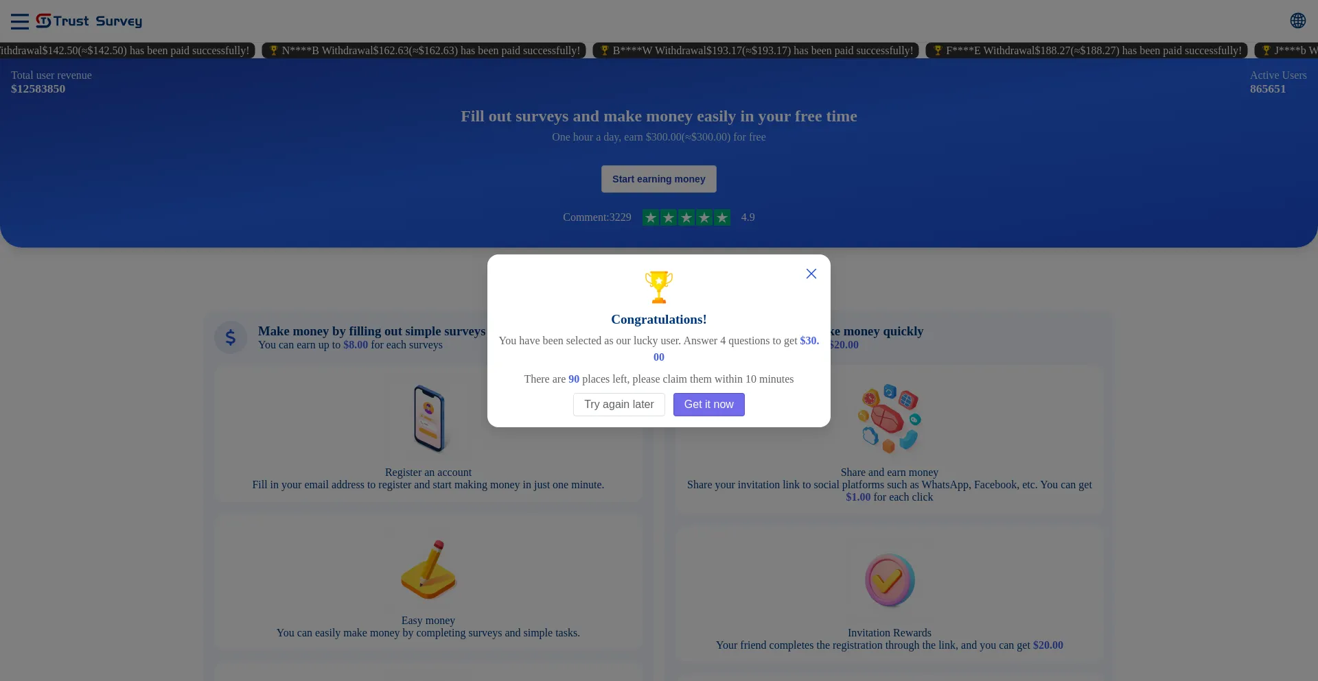 Trustrsurvey.top operates as a suspicious website with multiple red flags that compromise its trustworthiness and user safety. The platform exhibits concerning characteristics including misleading information, questionable operational practices, or potential malware distribution that poses significant risks to visitors.