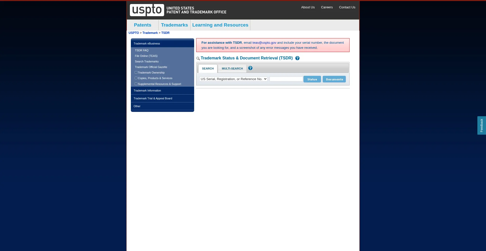 tmsearch.uspto.gov tbmp.uspto.gov www.google-analytics.com get.adobe.com tsdr.uspto.gov dap.digitalgov.gov etas.uspto.gov tfsr.uspto.gov gov1.siteintercept.qualtrics.com idm-tmng.uspto.gov +17 more