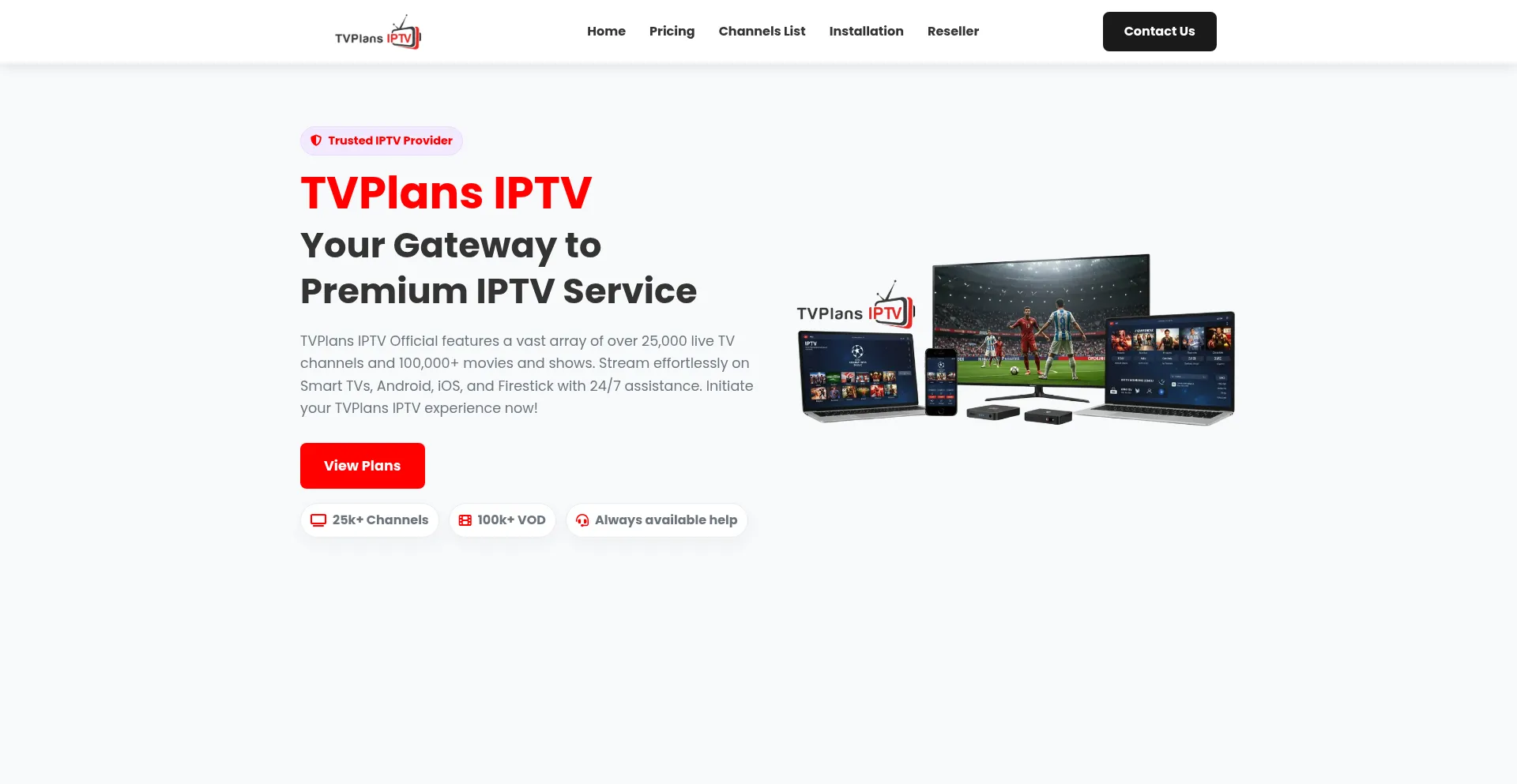 TVPlans IPTV offers live TV channels, VOD titles, and smooth 4K streaming quality. Join the best IPTV experience today with instant access and reliability.