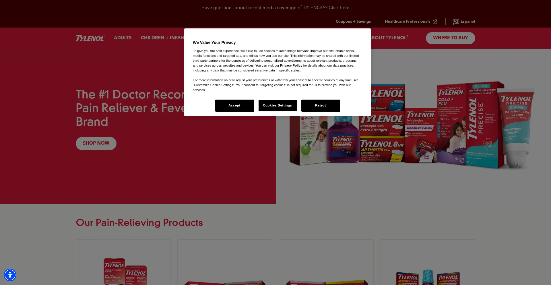 The website implements cookie consent mechanisms in compliance with privacy regulations such as GDPR or CCPA. This demonstrates that tylenol.com adheres to data protection standards and provides users with control over personal data collection practices.