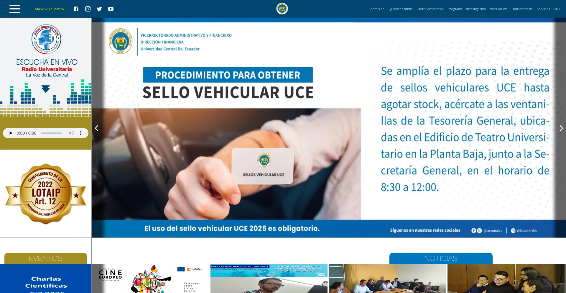 P�gina web oficial de la Universidad Central del Ecuador. Omnium Potentior est Sapientia. Educando al Ecuador desde 1826. Al servicio de la juventud.
