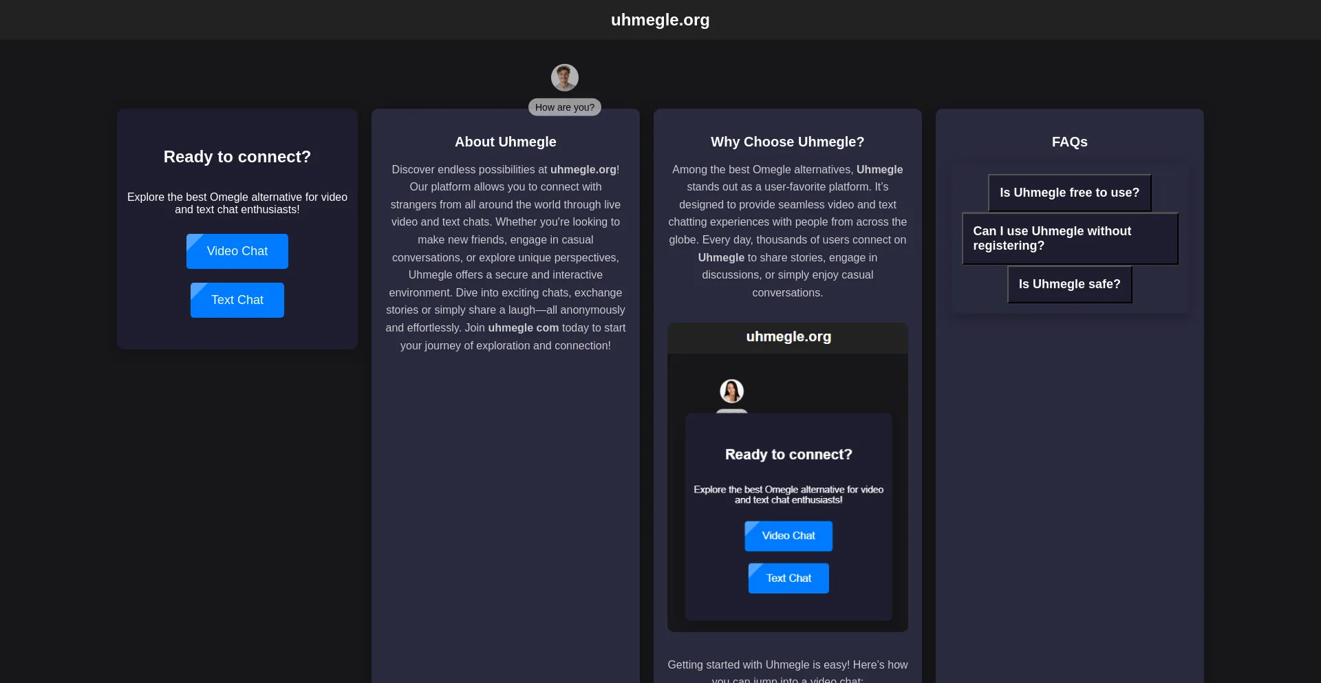 uhmegle.org is the best Omegle alternative for random video and text chat. Meet new people worldwide instantly and enjoy real conversations 24/7.