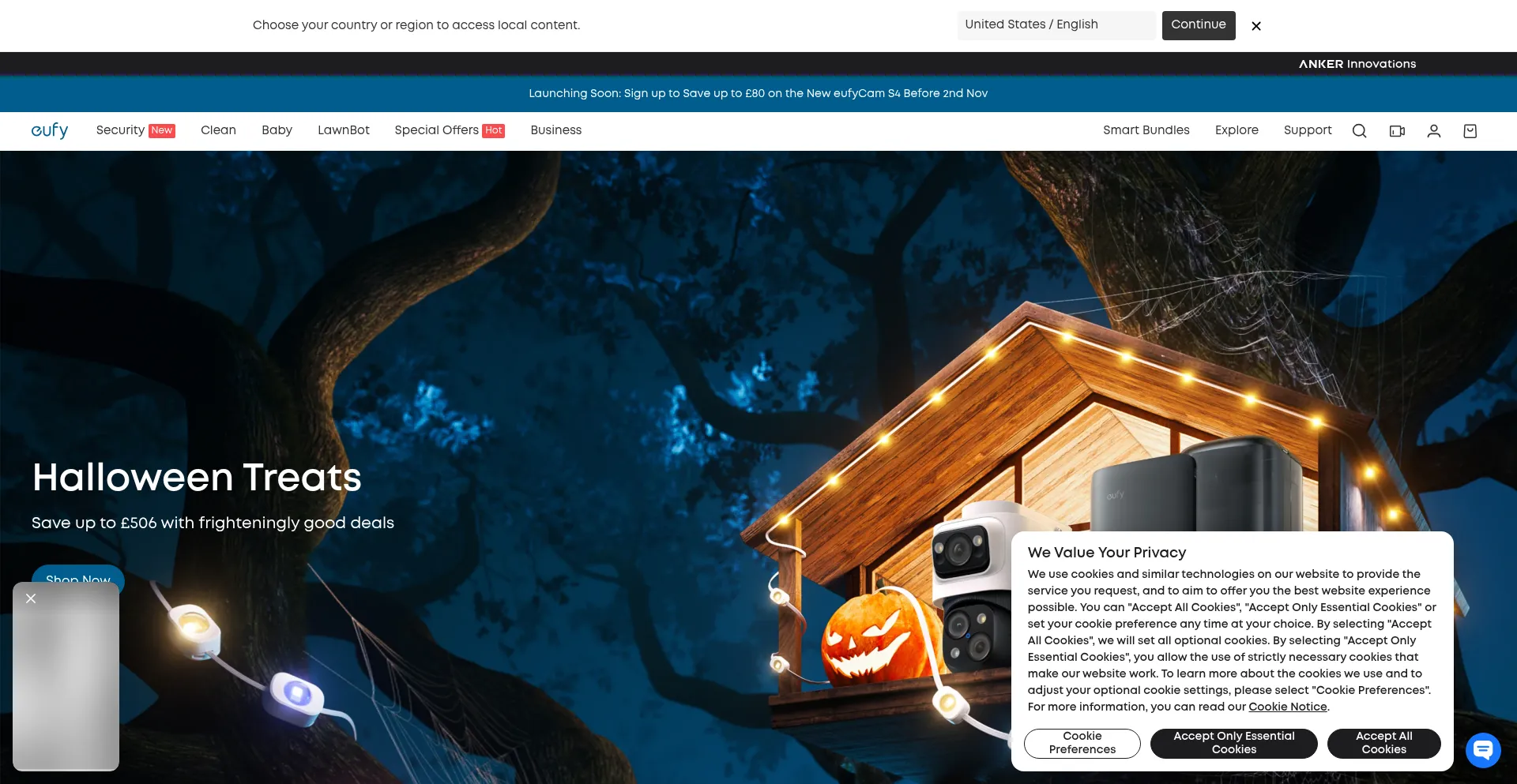 Analysis indicates that uk.eufy.com operates as an e-commerce platform facilitating online transactions for goods or services. The website implements shopping cart functionality, payment processing systems, and product catalog features typical of commercial retail operations.