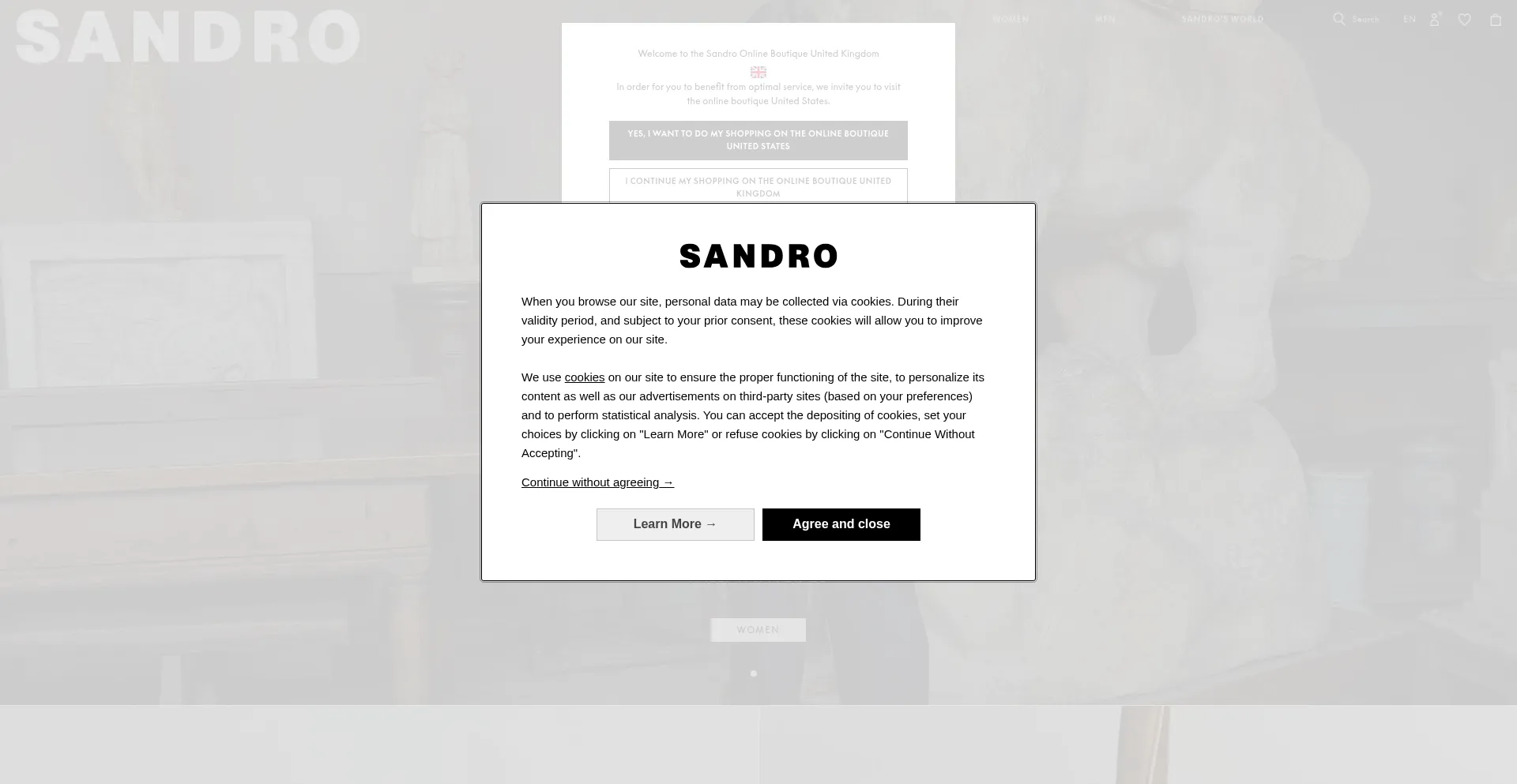 The website implements cookie consent mechanisms in compliance with privacy regulations such as GDPR or CCPA. This demonstrates that uk.sandro-paris.com adheres to data protection standards and provides users with control over personal data collection practices.