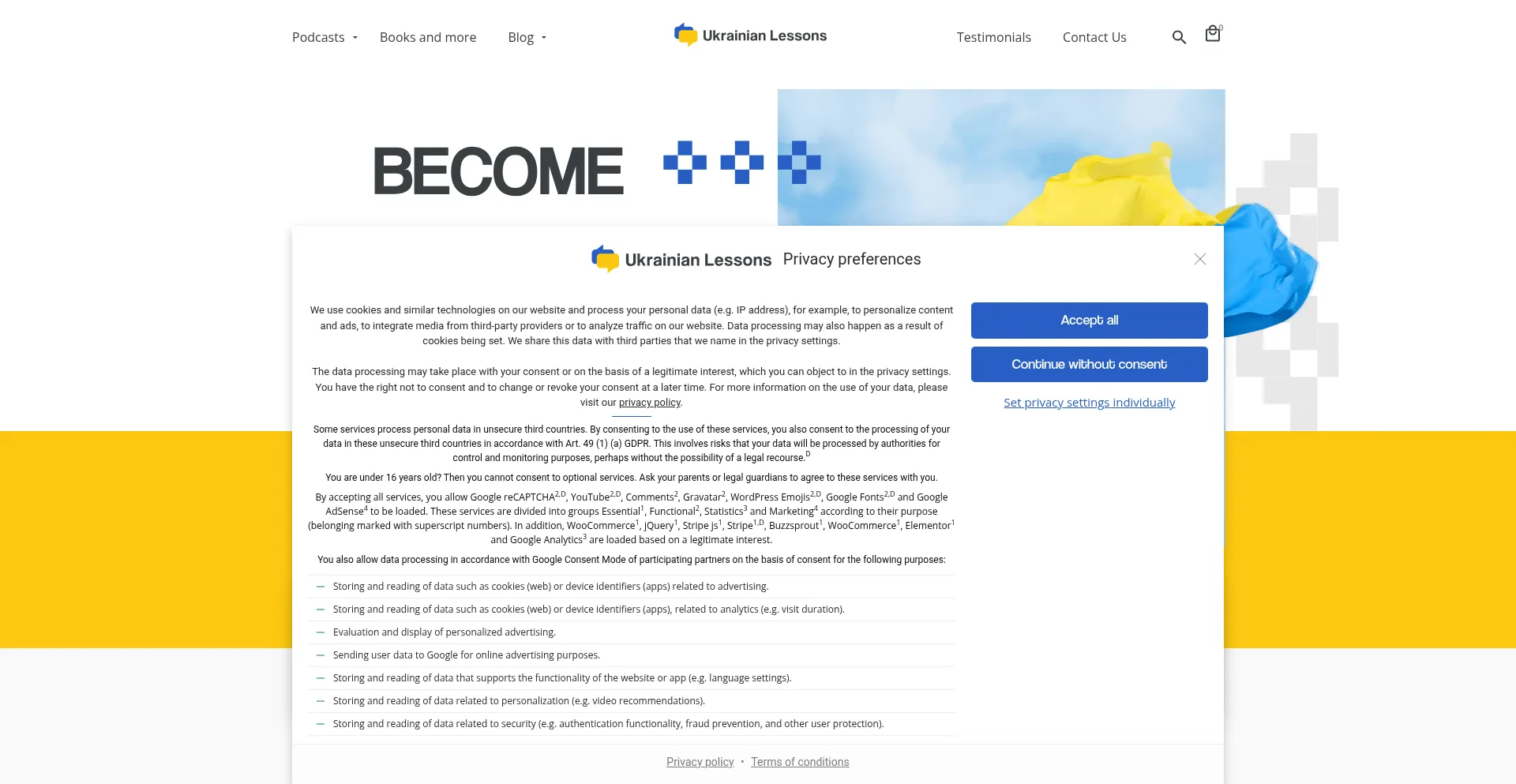 The website implements cookie consent mechanisms in compliance with privacy regulations such as GDPR or CCPA. This demonstrates that ukrainianlessons.com adheres to data protection standards and provides users with control over personal data collection practices.