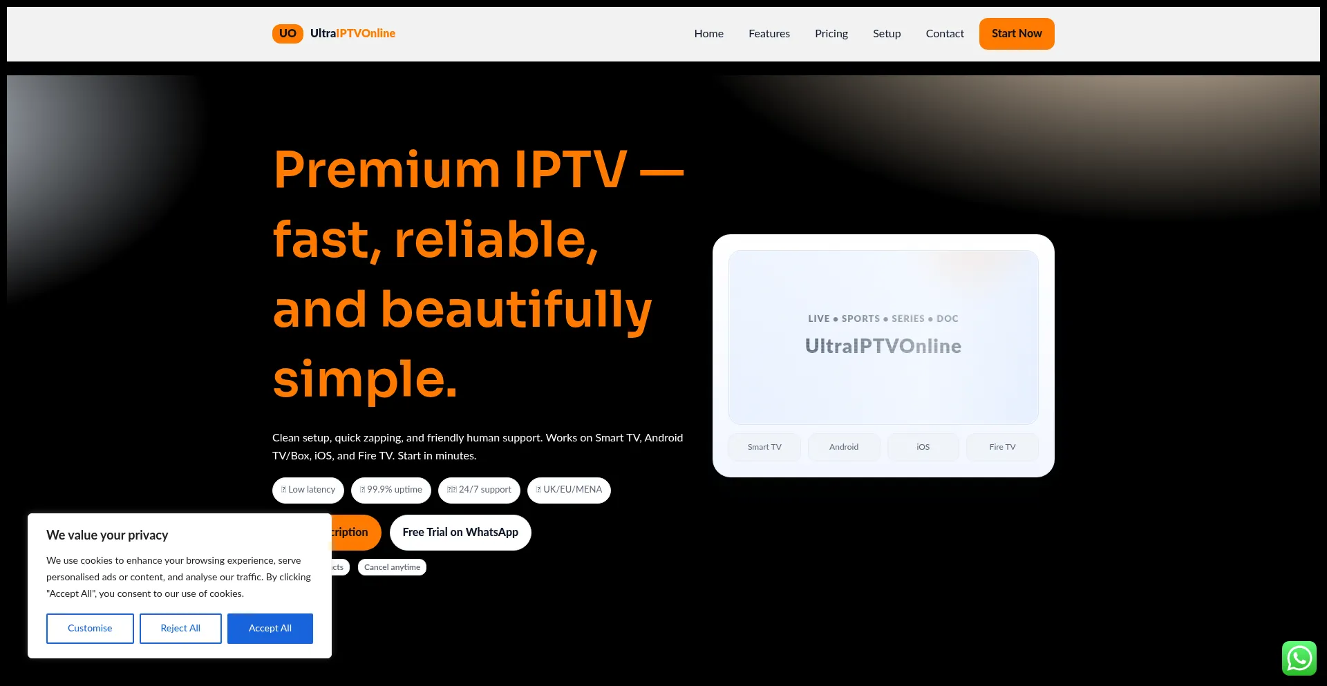 The website implements cookie consent mechanisms in compliance with privacy regulations such as GDPR or CCPA. This demonstrates that ultraiptvonline.com adheres to data protection standards and provides users with control over personal data collection practices.