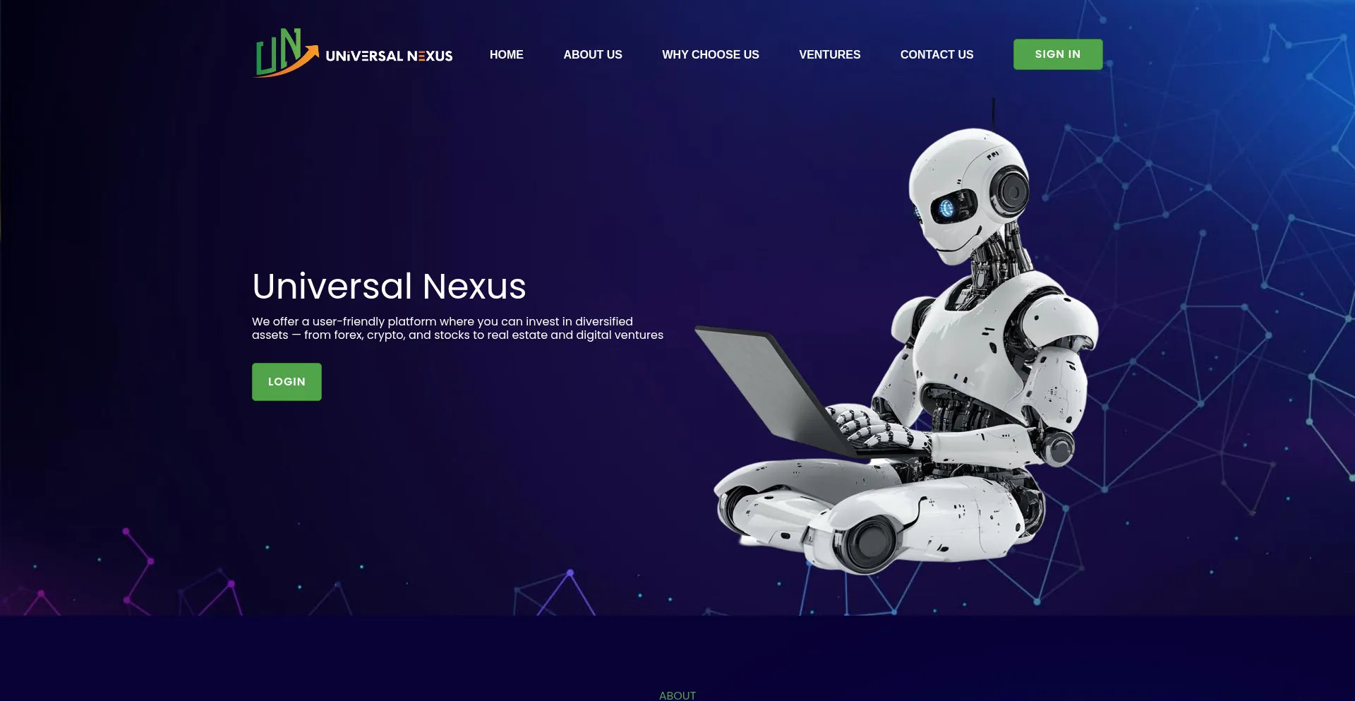 The universalnexus.io website provides financial services including investment management, wealth advisory, or financial planning solutions. Services may encompass portfolio management, investment opportunities, financial consulting, or asset growth strategies for individual and institutional clients.