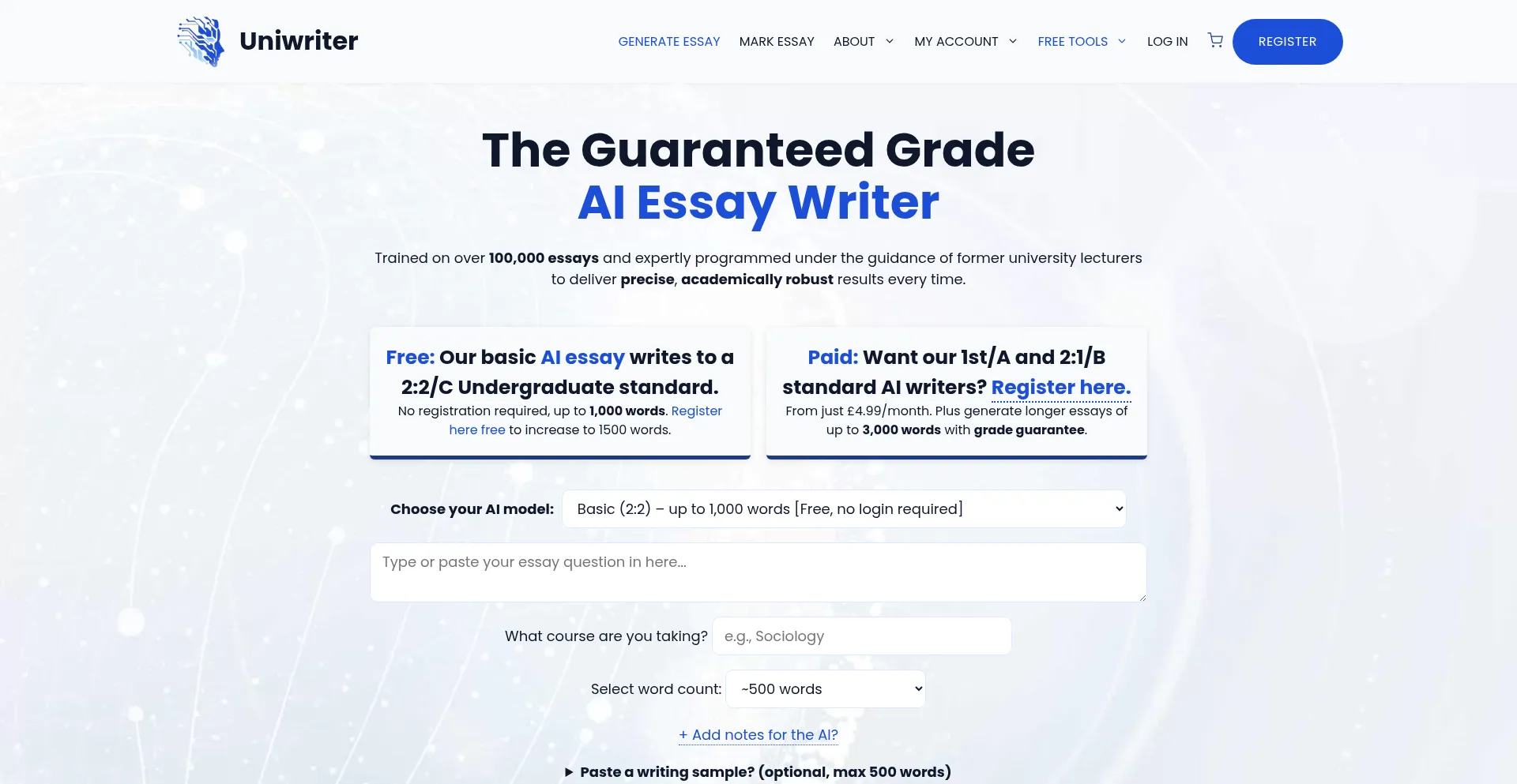 Use our AI essay writer to generate an essay now. Basic model (free, no registration) up to 1,500 words or premium with grade guarantee.