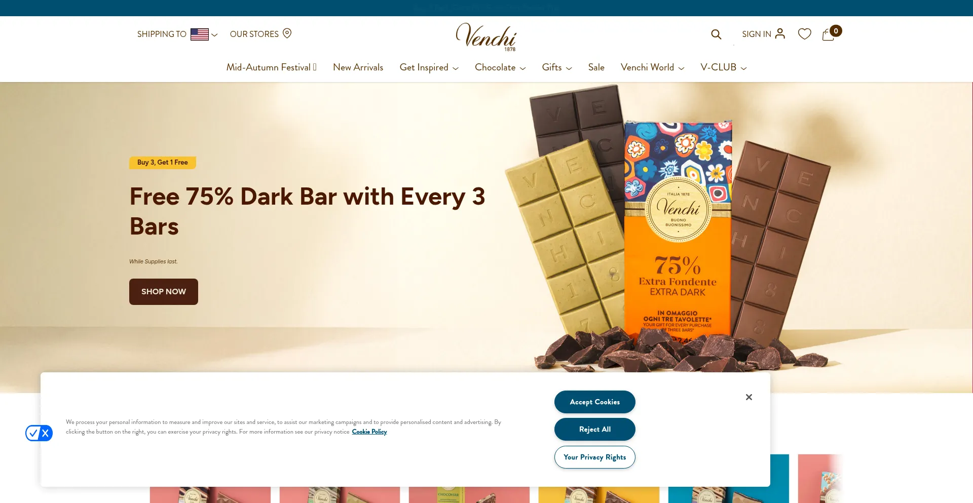 The website implements cookie consent mechanisms in compliance with privacy regulations such as GDPR or CCPA. This demonstrates that us.venchi.com adheres to data protection standards and provides users with control over personal data collection practices.