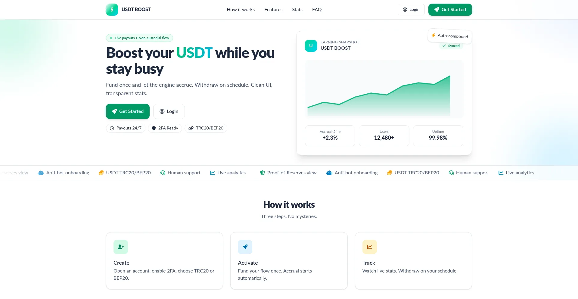 USDT BOOST — Simple earning flows for busy people. Fund, accrue, withdraw. Track everything in real time.