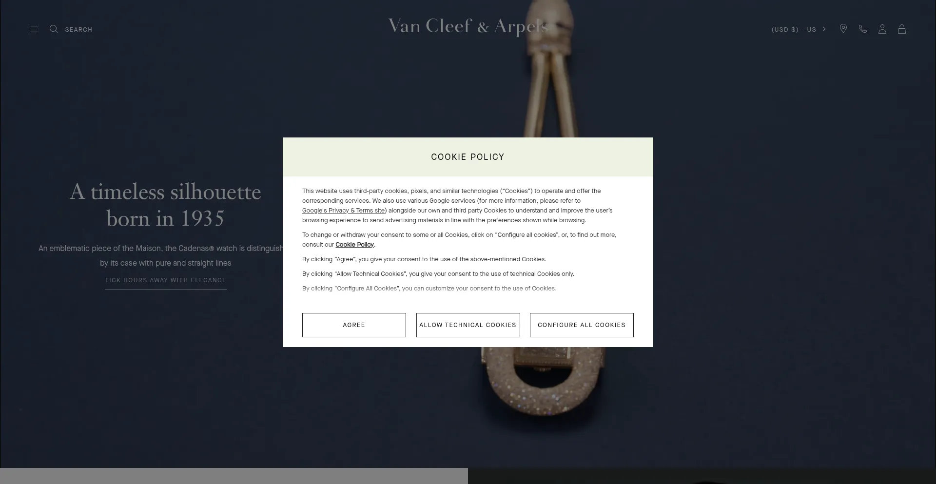 The website implements cookie consent mechanisms in compliance with privacy regulations such as GDPR or CCPA. This demonstrates that vancleefarpels.com adheres to data protection standards and provides users with control over personal data collection practices.