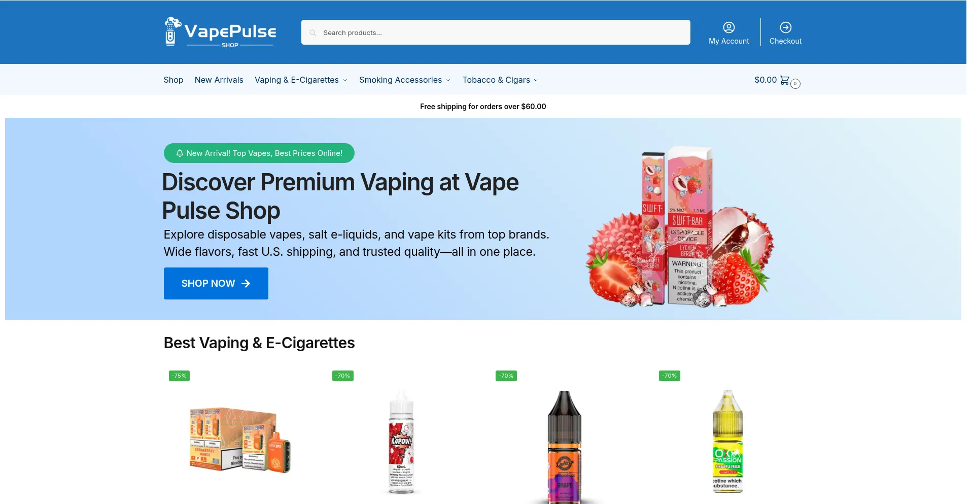 Shop premium disposable vapes, nicotine salt e-liquids, vape kits & accessories at VapePulse. Wide flavor selection, fast U.S. shipping & top brands. Shop now!