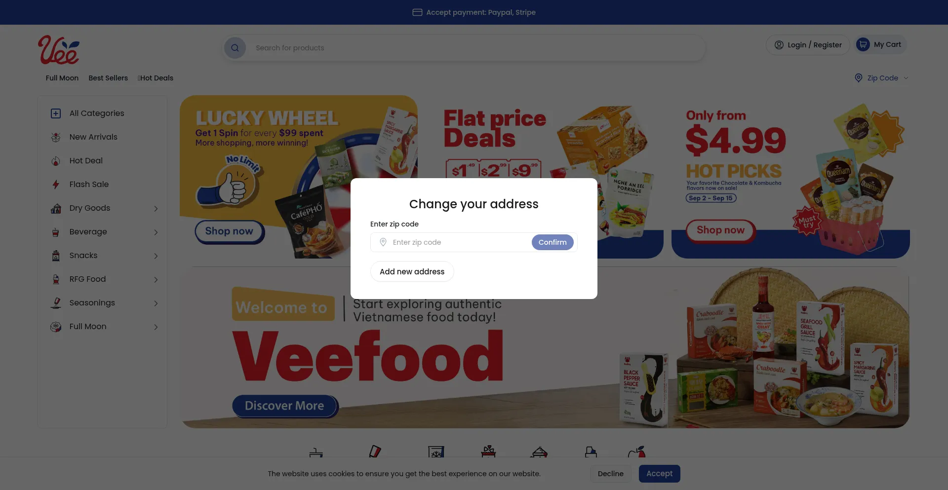 Analysis indicates that veefood.com operates as an e-commerce platform facilitating online transactions for goods or services. The website implements shopping cart functionality, payment processing systems, and product catalog features typical of commercial retail operations.
