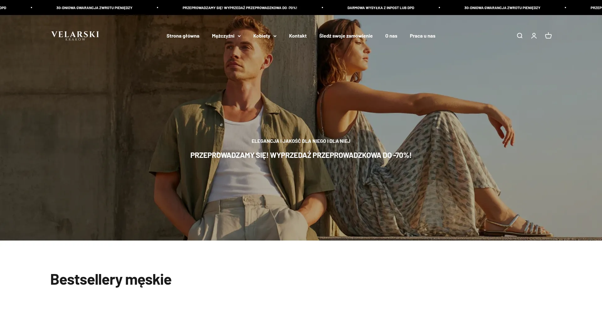 Analysis indicates that velarskikrakow.com operates as an e-commerce platform facilitating online transactions for goods or services. The website implements shopping cart functionality, payment processing systems, and product catalog features typical of commercial retail operations.