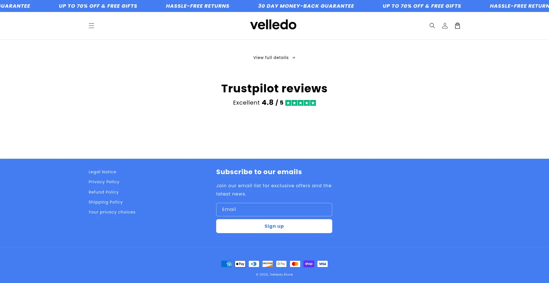 Velledo.store operates as a suspicious website with multiple red flags that compromise its trustworthiness and user safety. The platform exhibits concerning characteristics including misleading information, questionable operational practices, or potential malware distribution that poses significant risks to visitors.