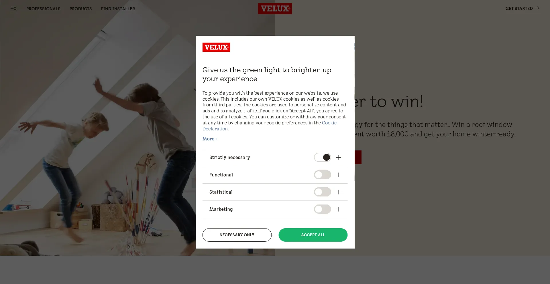 The website implements cookie consent mechanisms in compliance with privacy regulations such as GDPR or CCPA. This demonstrates that velux.uk adheres to data protection standards and provides users with control over personal data collection practices.