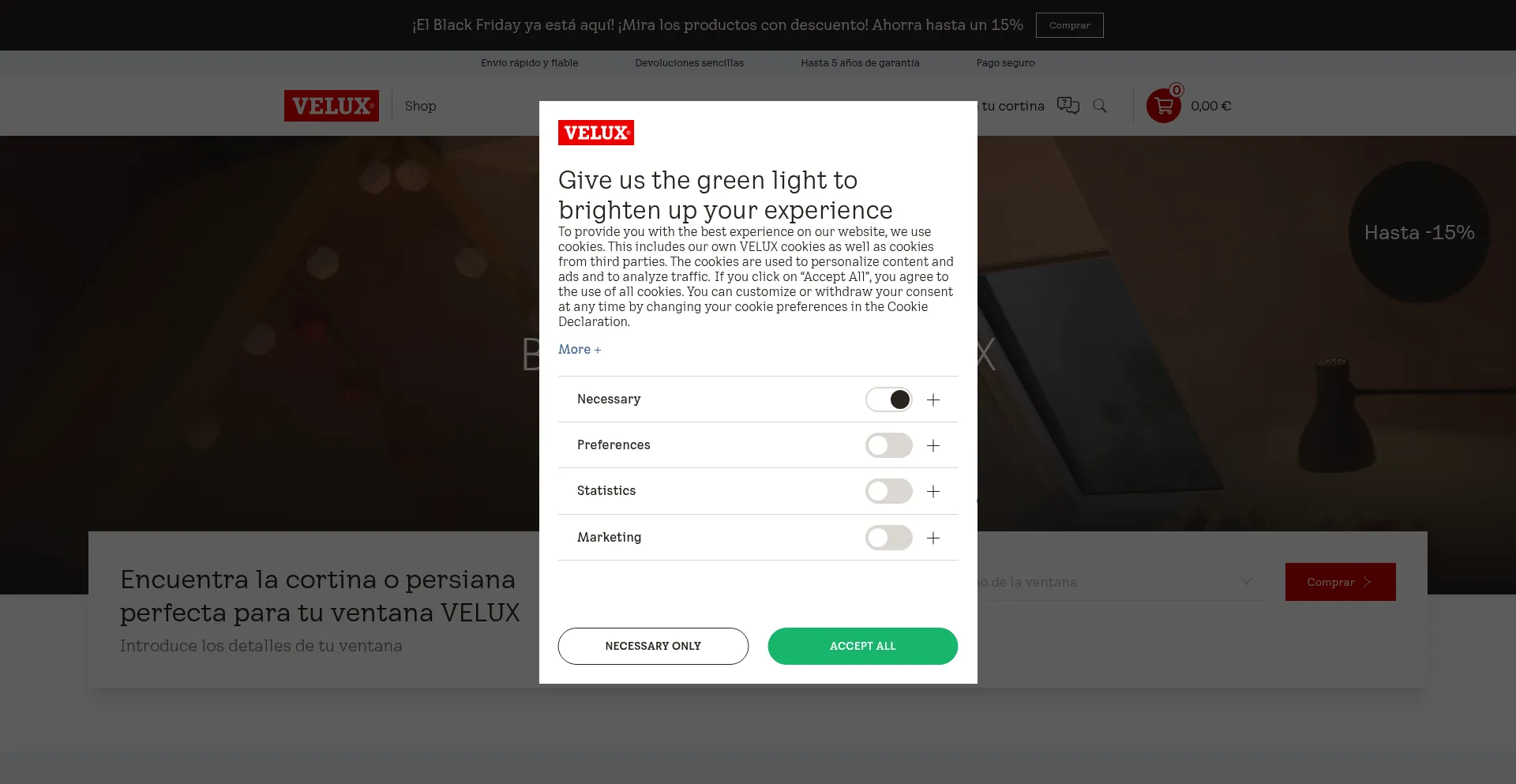 The website implements cookie consent mechanisms in compliance with privacy regulations such as GDPR or CCPA. This demonstrates that veluxshop.es adheres to data protection standards and provides users with control over personal data collection practices.