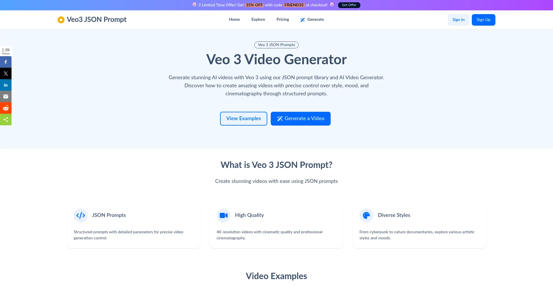 Generate stunning AI videos with Veo3 using our JSON prompt library and intelligent prompt generator. The best Veo3 AI video generator for creating amazing videos.