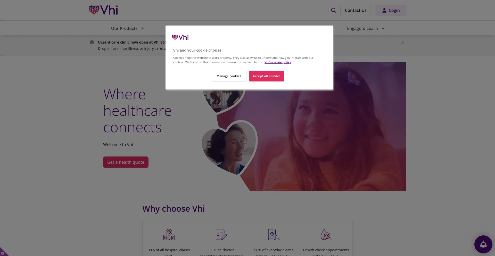 The website implements cookie consent mechanisms in compliance with privacy regulations such as GDPR or CCPA. This demonstrates that vhi.ie adheres to data protection standards and provides users with control over personal data collection practices.
