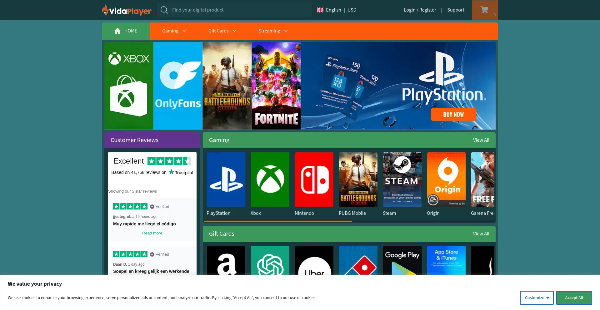 🥇 Buy gift and prepaid cards online here | VidaPlayer