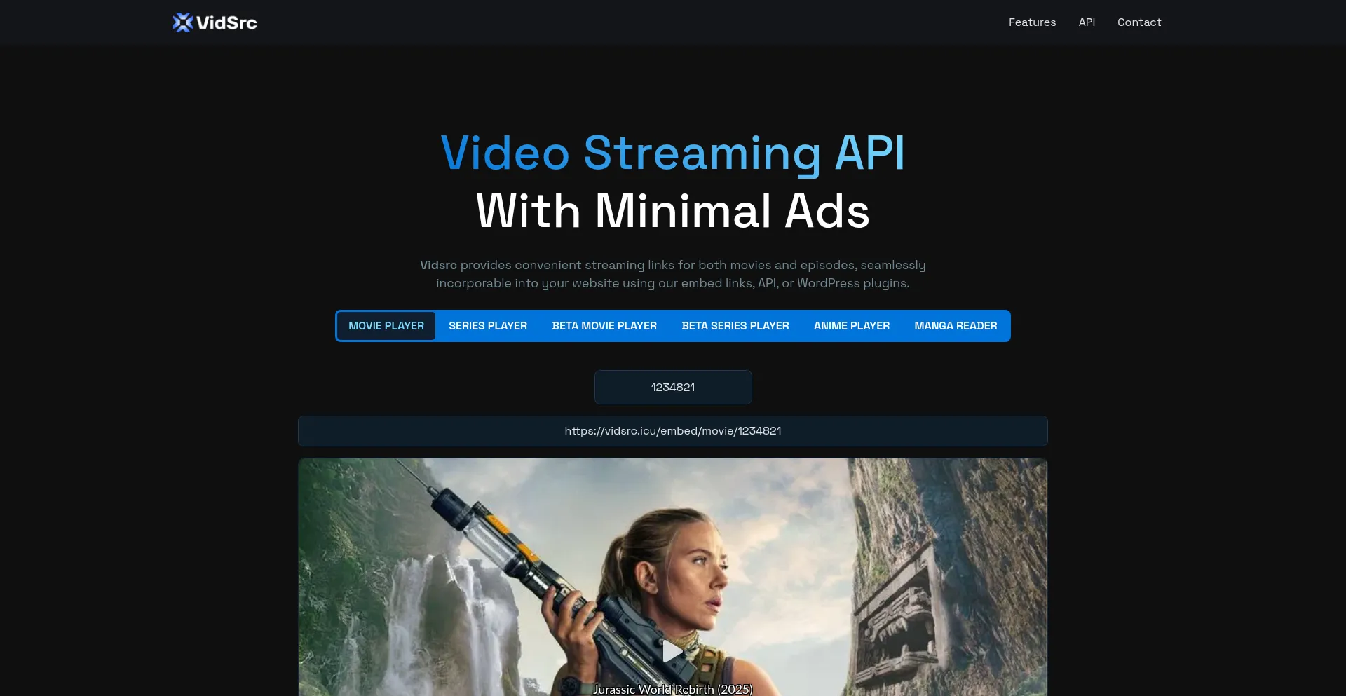 VidSrc is a free video streaming API providing seamless integration of free movie and episode streaming links through embeds and our API for your website.