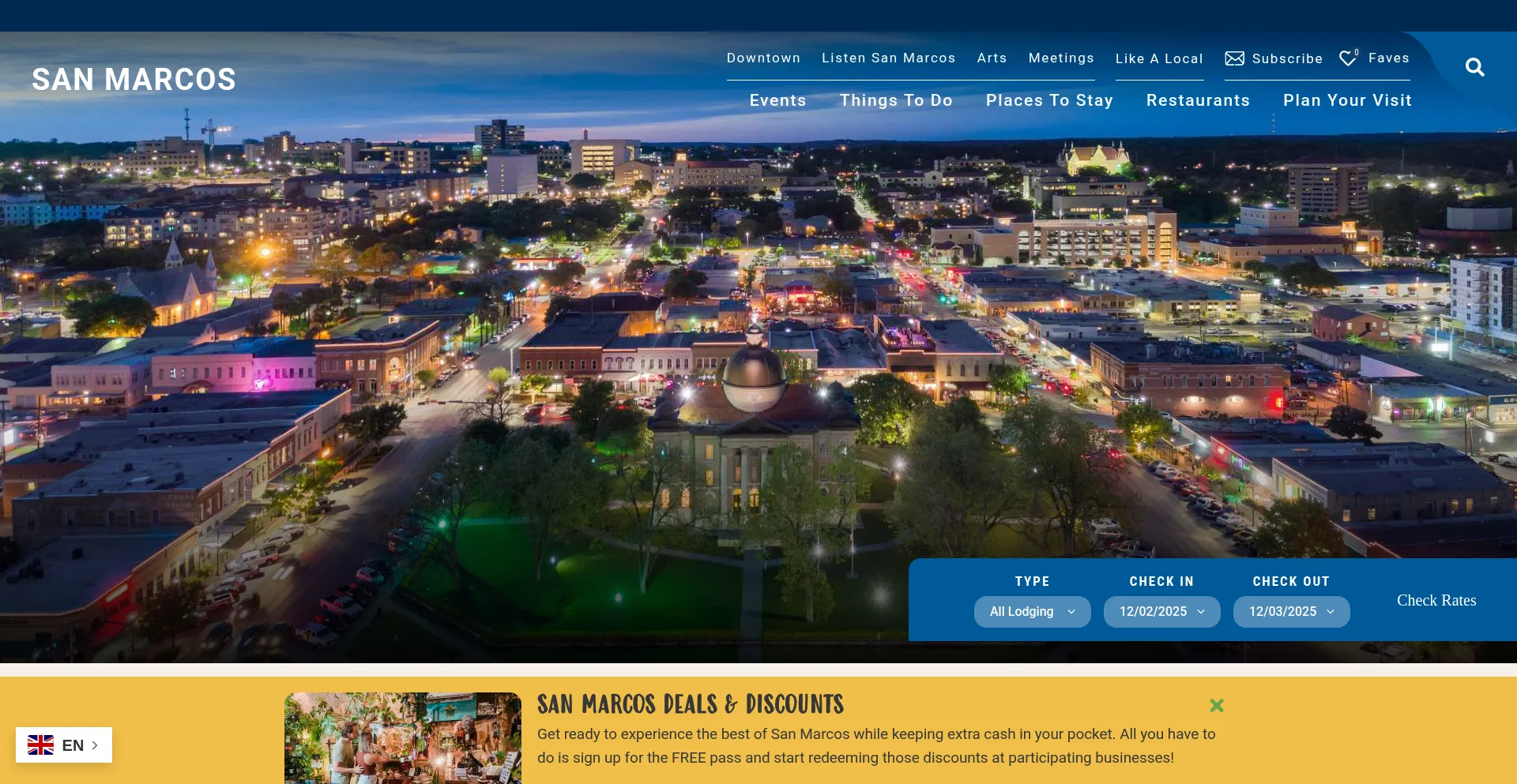 Come see the center of it all in San Marcos, TX. Experience the outdoors or downtown. Eat at fabulous restaurants and enjoy a relaxing stay at a hotel.