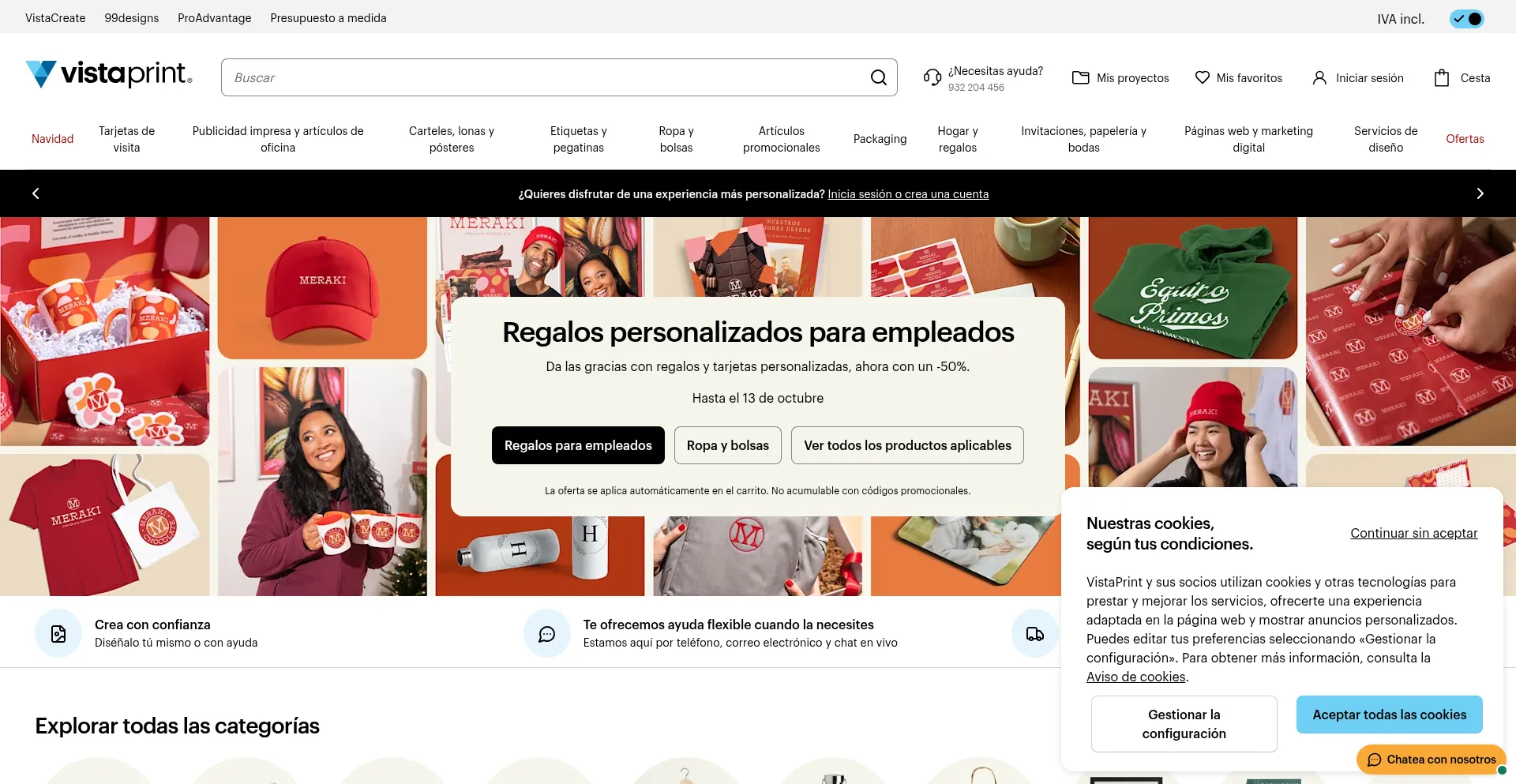 Analysis indicates that vistaprint.es operates as an e-commerce platform facilitating online transactions for goods or services. The website implements shopping cart functionality, payment processing systems, and product catalog features typical of commercial retail operations.