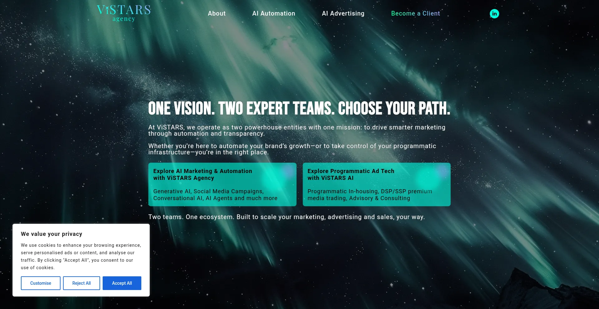 ViSTARS unites two expert teams. ViSTARS Agency leads with Generative AI and marketing automation. ViSTARS AI delivers DSP/SSP, in-housing, and programmatic infrastructure for t...