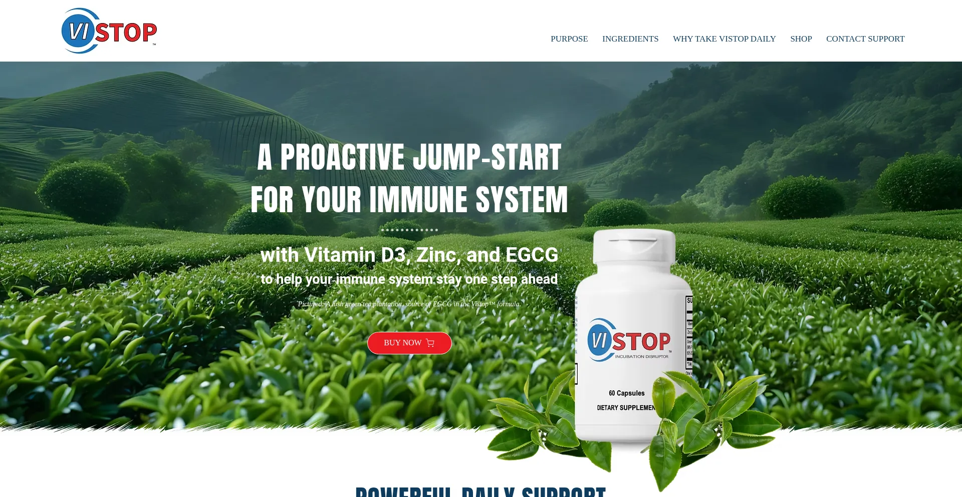 Vistop™ is a daily immune support supplement made with Vitamin D3, Zinc, and Green Tea Extract (EGCG) to help disrupt virus incubation and strengthen your natural defenses—t...