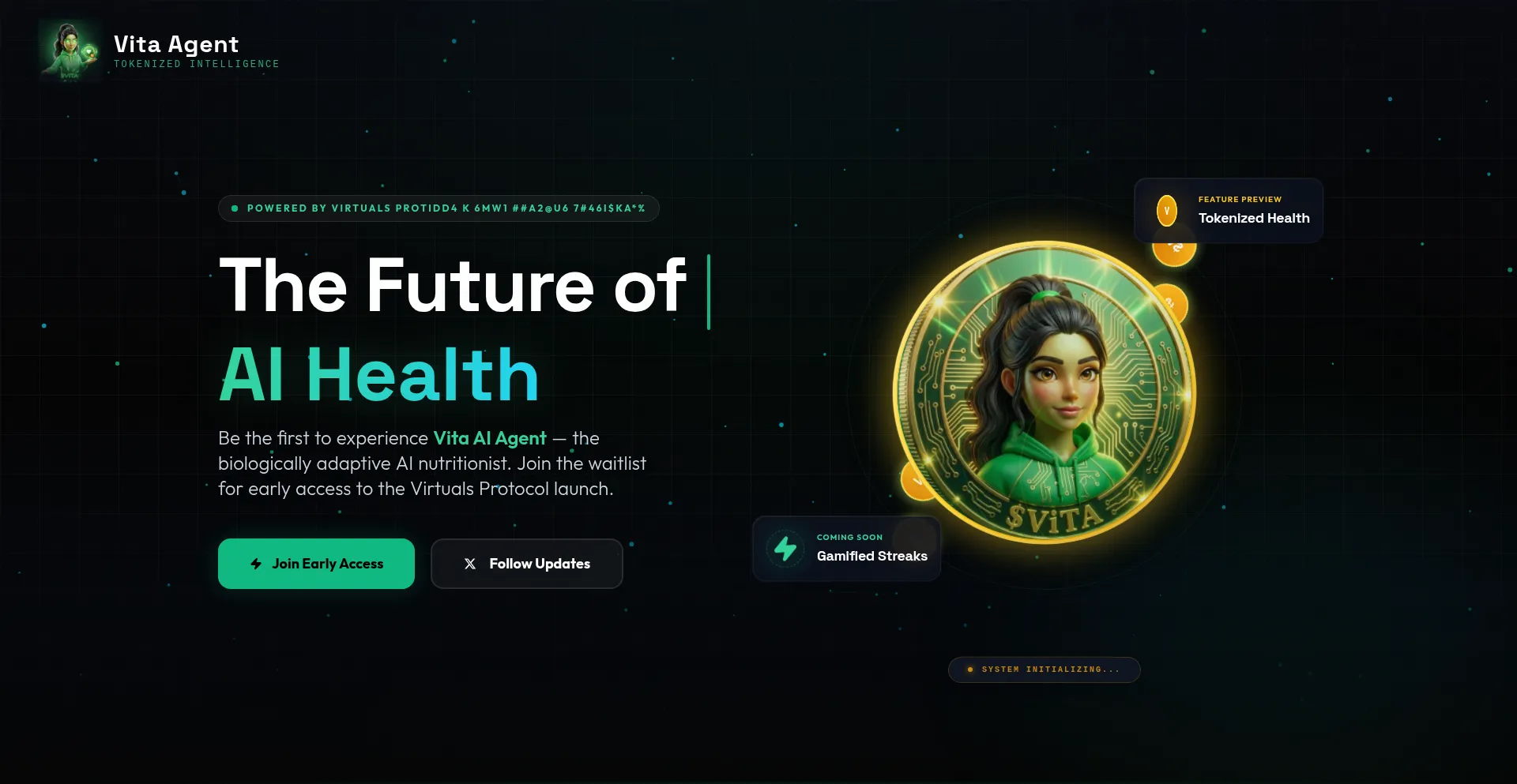 Own the AI nutrition coach that actually cares. Vita Agent - WHO-backed, personalized nutrition, tokenized on Virtuals Protocol. Launching Q1 2026.