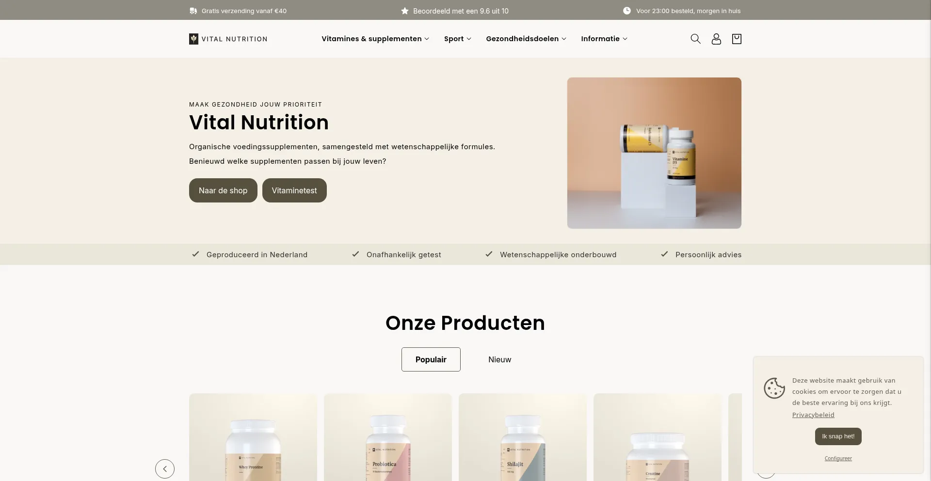 Vital Nutrition. Hoogwaardige kwaliteit. Natuurlijke ingrediënten. Geproduceerd in Nederland. Maak gezondheid jouw prioriteit.