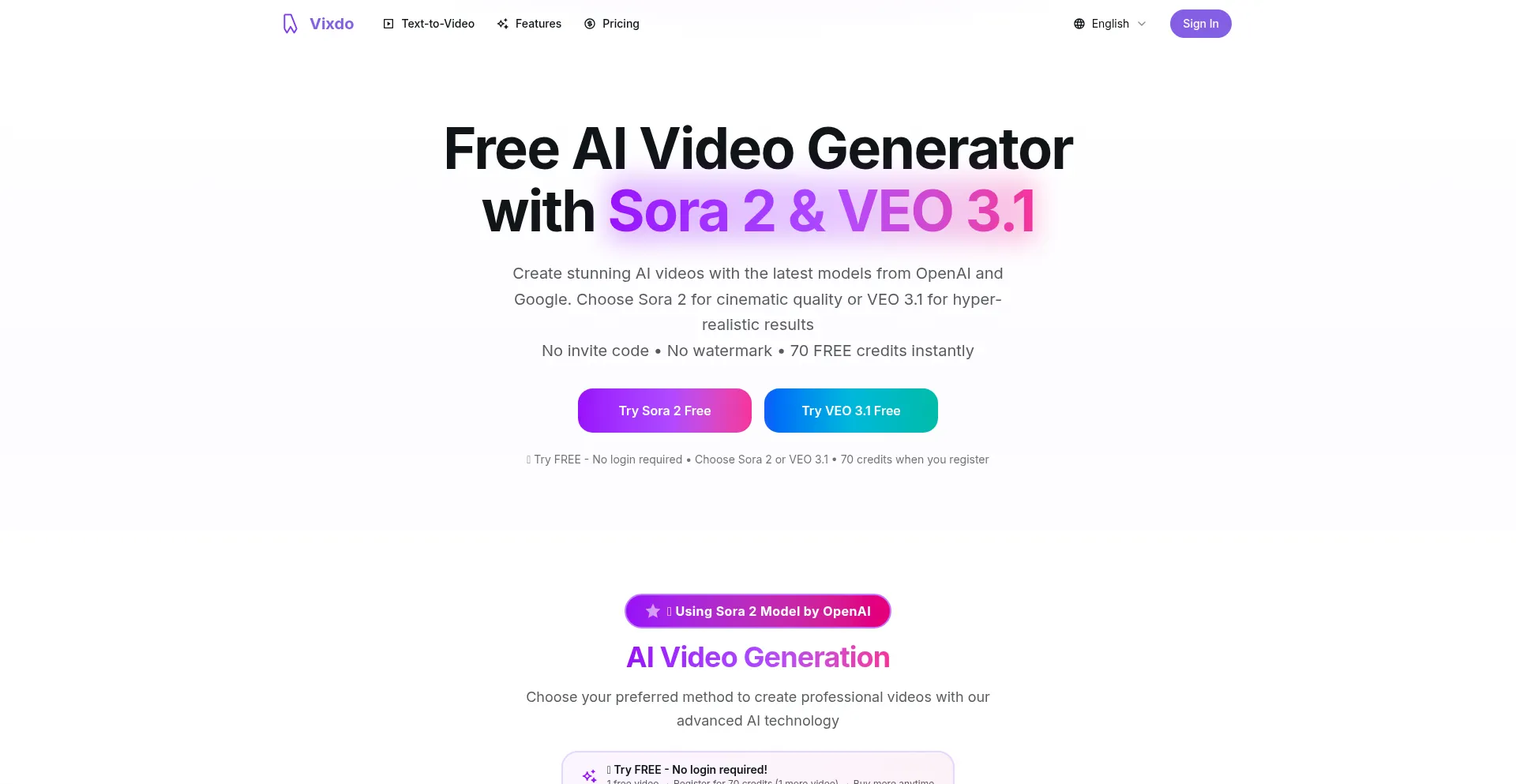 Vixdo: Use Sora 2 and Veo 3.1 without invite codes or waitlists. Free alternative to OpenAI Sora and Google Flow. Get 70 credits instantly, no credit card, no watermark.