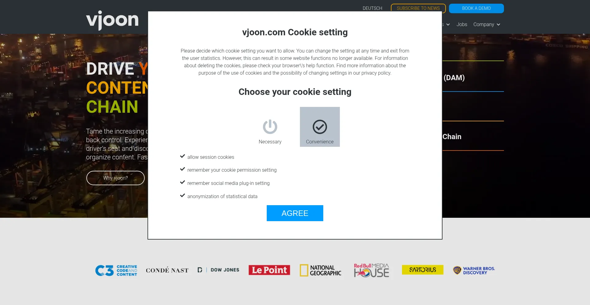The website implements cookie consent mechanisms in compliance with privacy regulations such as GDPR or CCPA. This demonstrates that vjoon.com adheres to data protection standards and provides users with control over personal data collection practices.