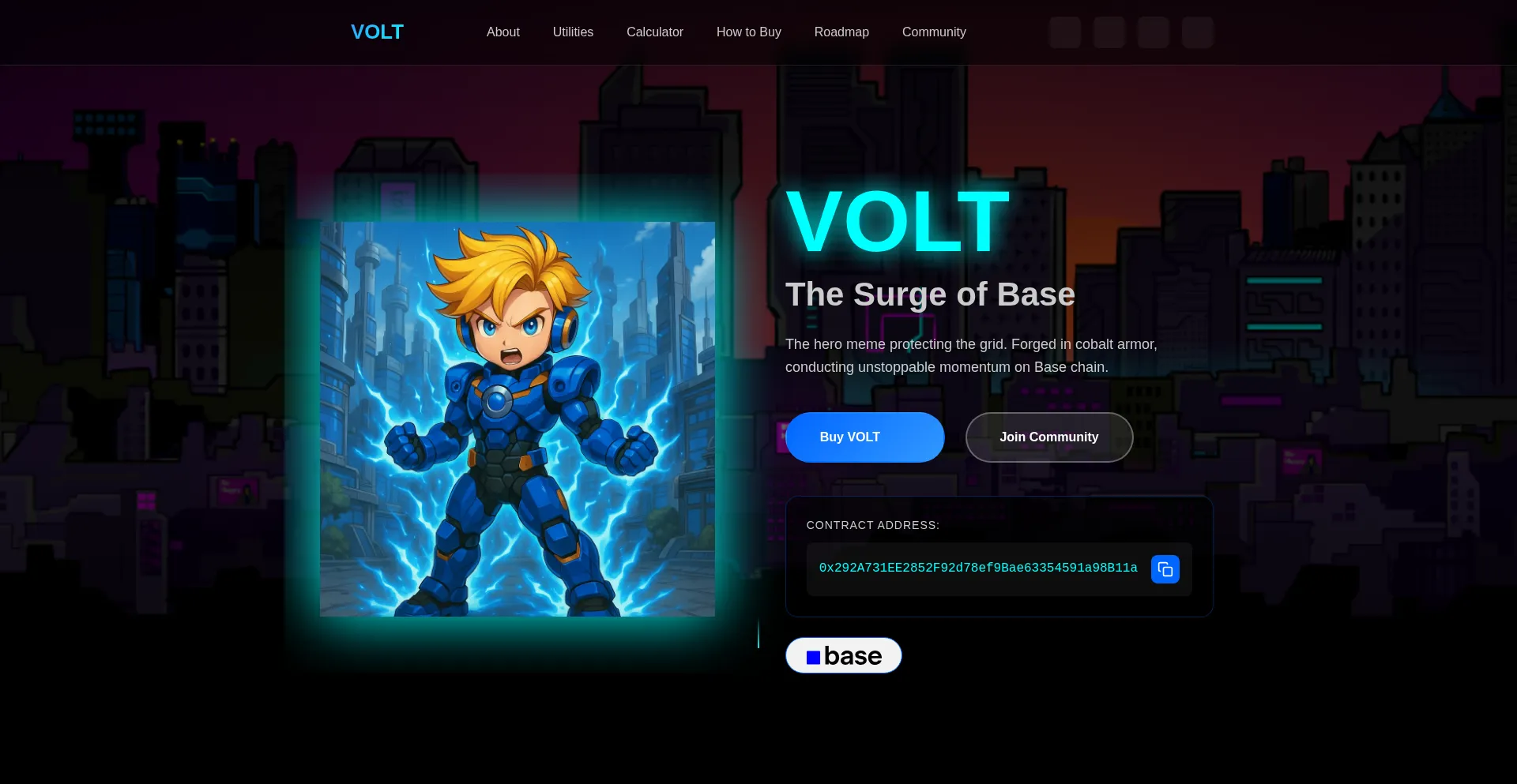 VOLT is the surge of Base - a hero meme token with utilities including VoltScan, Buy Bot, Trending Bot, and Volume Bot. Join the electric revolution.