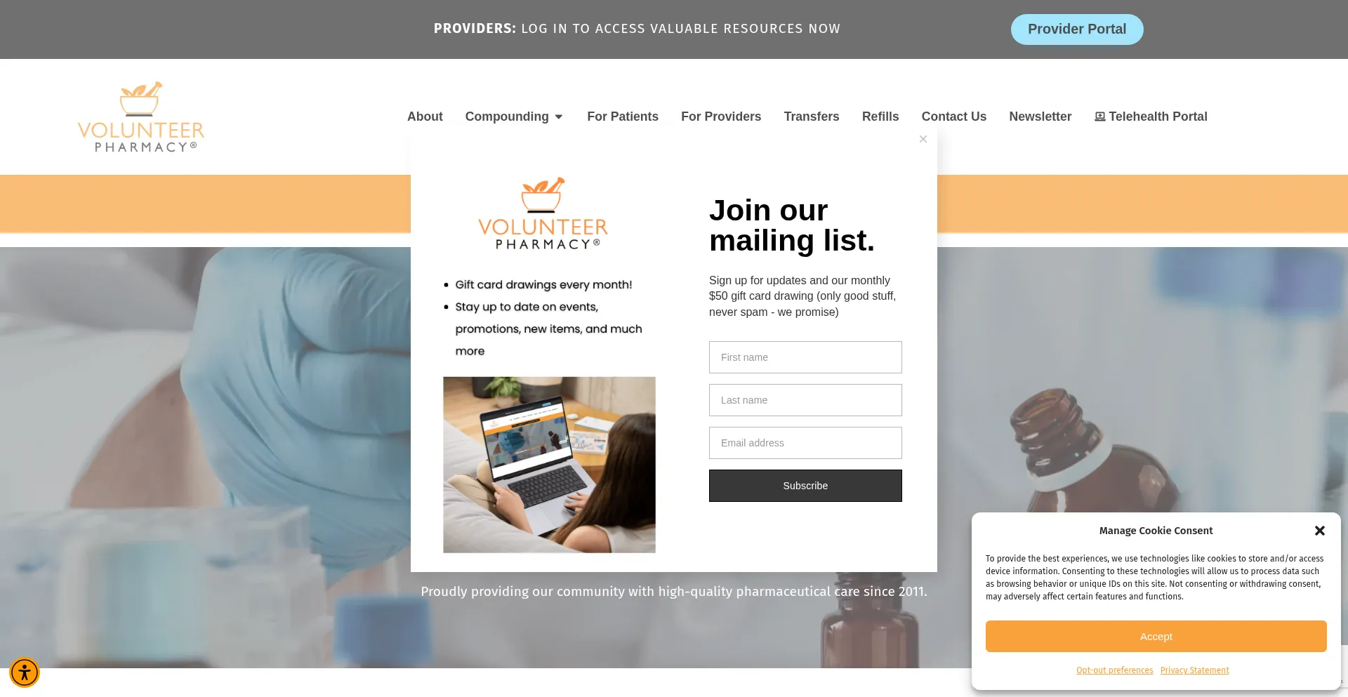 The website implements cookie consent mechanisms in compliance with privacy regulations such as GDPR or CCPA. This demonstrates that volunteerpharmacy.com adheres to data protection standards and provides users with control over personal data collection practices.