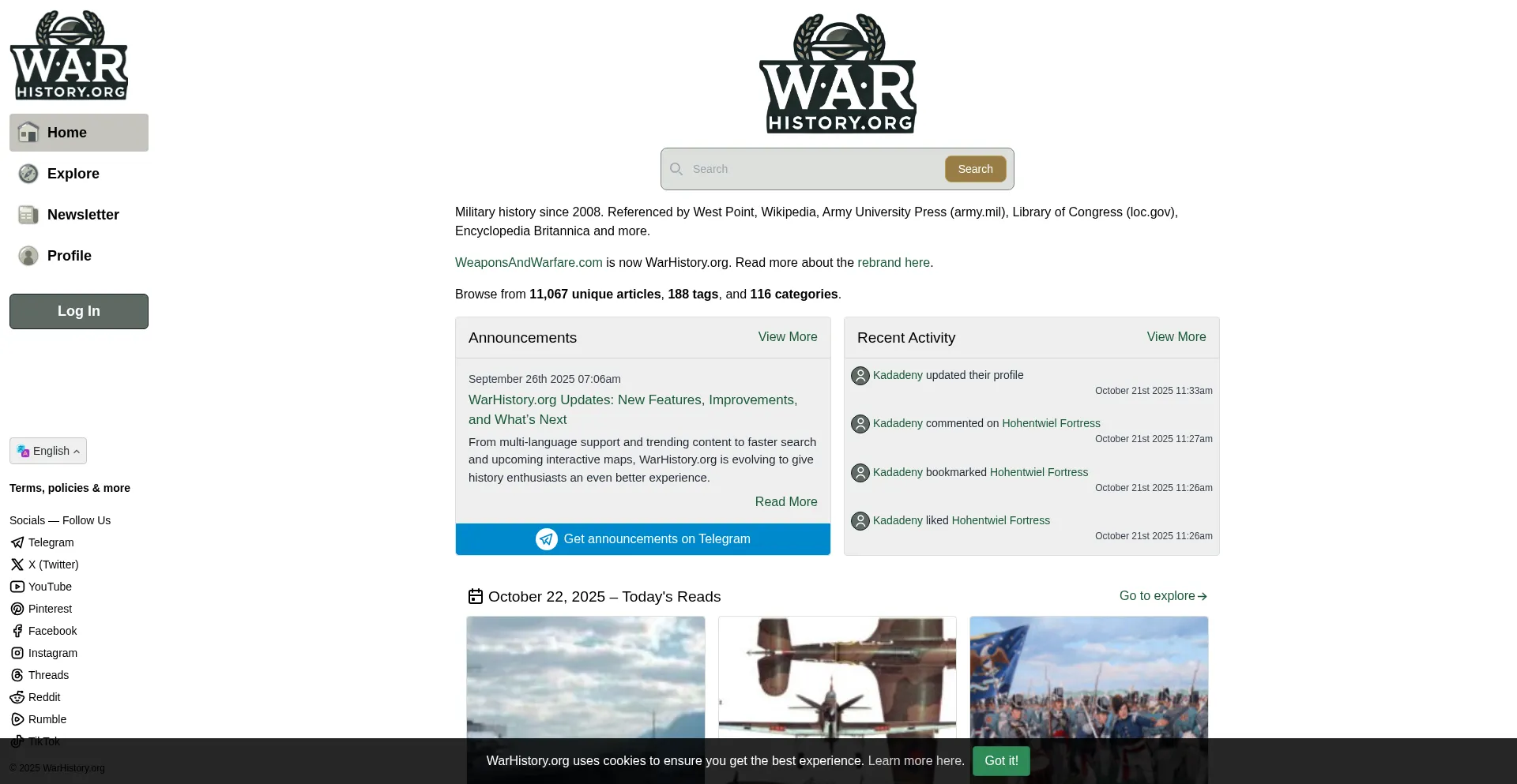 Military history since 2008. Browse the catalogue of 10,000+ articles ranging over thousands of years of combat history.