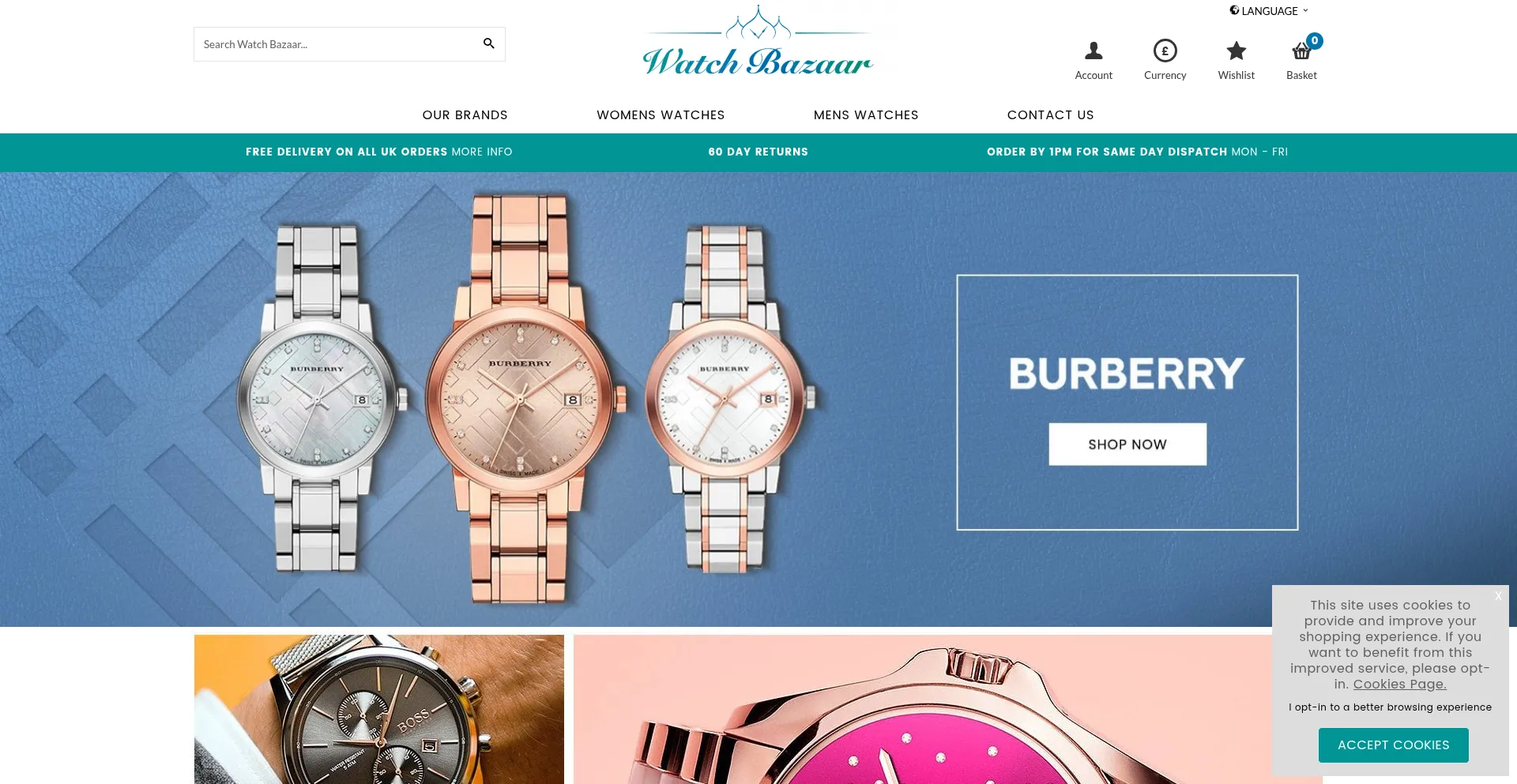 Analysis indicates that watchbazaar.com operates as an e-commerce platform facilitating online transactions for goods or services. The website implements shopping cart functionality, payment processing systems, and product catalog features typical of commercial retail operations.