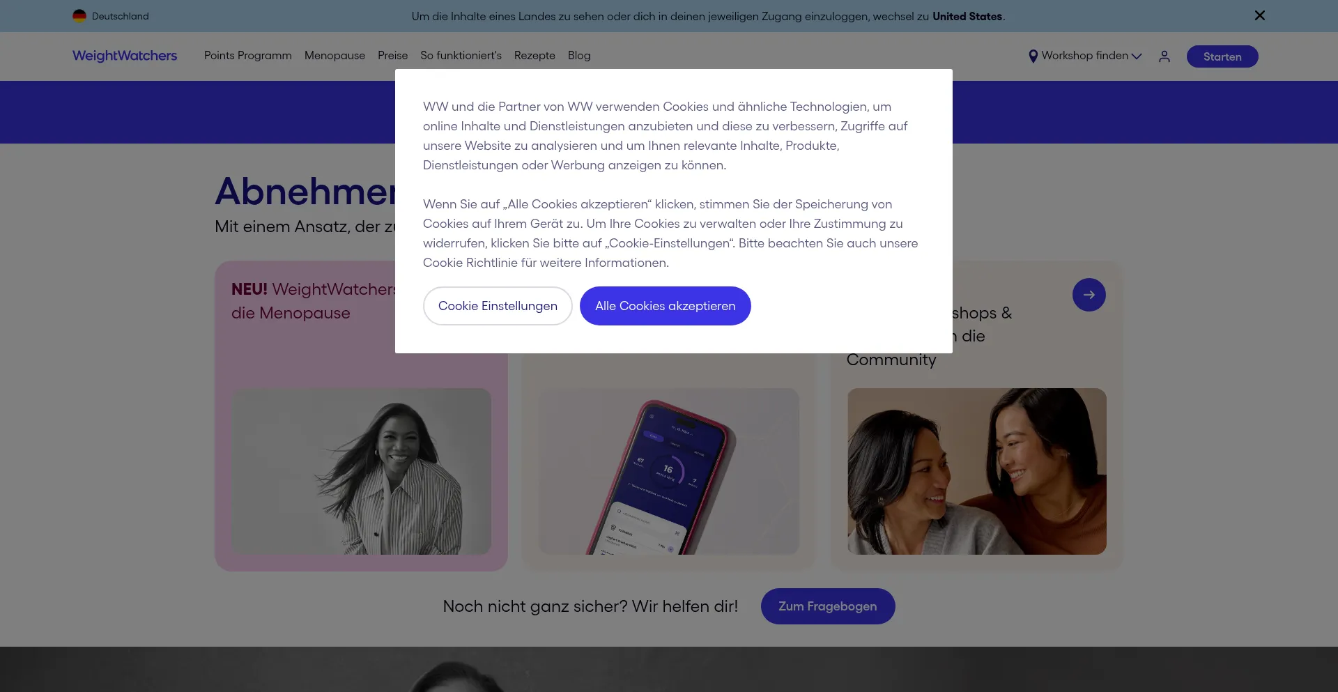 The website implements cookie consent mechanisms in compliance with privacy regulations such as GDPR or CCPA. This demonstrates that weightwatchers.de adheres to data protection standards and provides users with control over personal data collection practices.