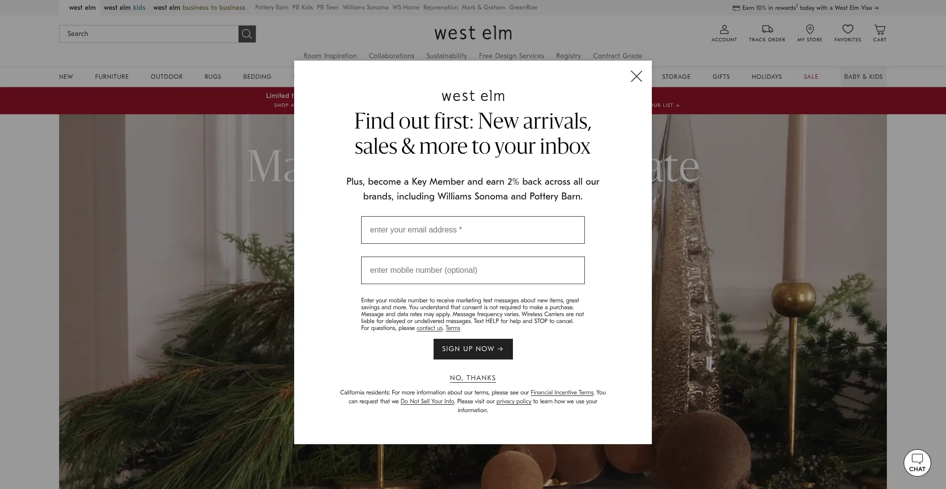 The westelm.com website implements data collection forms that may request personal information including names, email addresses, phone numbers, or other sensitive details. Users should verify the legitimacy of it and review privacy policies before submitting personal data.