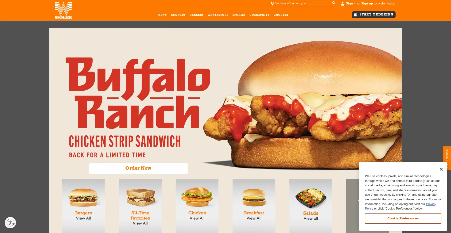 The website implements cookie consent mechanisms in compliance with privacy regulations such as GDPR or CCPA. This demonstrates that whataburger.com adheres to data protection standards and provides users with control over personal data collection practices.