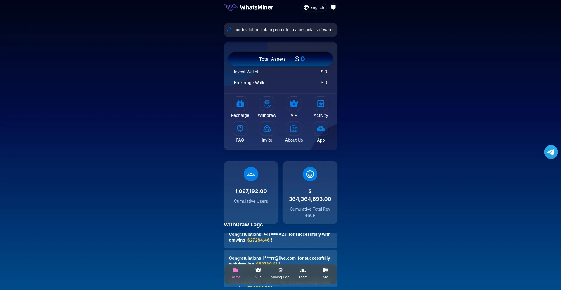 The whatsminer.one probably offers cloud mining services or cryptocurrency mining investments. Some platforms provide legitimate mining rental services, while others may use fake mining dashboards to display virtual earnings that cannot be withdrawn.